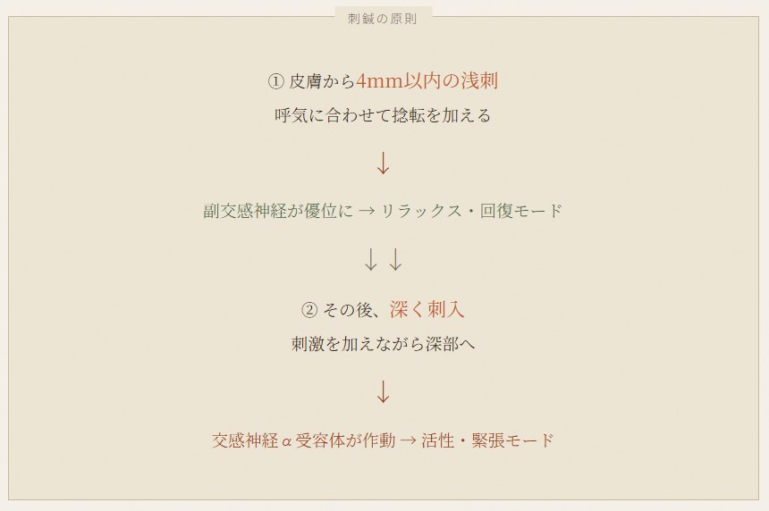 鍼灸治療の原則として、いきなり深い刺激(交感神経刺激)を与えるのではなく、まずはこの浅刺によって副交感神経を持ち上げることで患者の体はリラックスし、深く刺しても痛みを感じにくくなります。