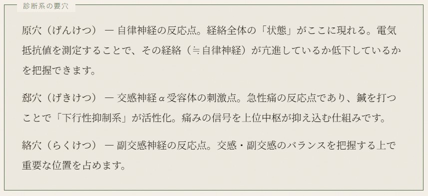 それは、自律神経と内分泌系への精密なインターフェースであり、古典医学が長い臨床の歴史から発見した「身体の設計図」でもあるのです。